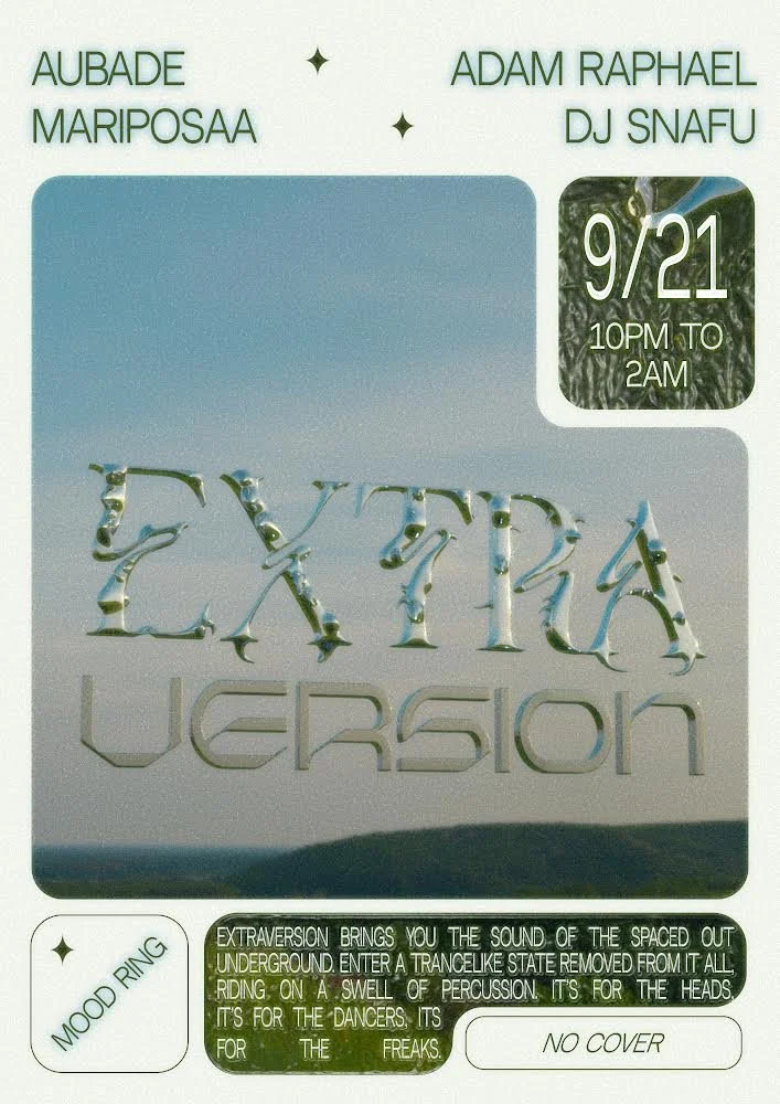 Extraversion with Aubade, Mariposaa, Adam Raphael, DJ Snafu Wednesday, September 21, 2022 10:00 PM Thursday, September 22, 2022 2:00 AM Mood Ring 1260 Myrtle Avenue Brooklyn, NY, 11221 United States (map) Google Calendar ICS