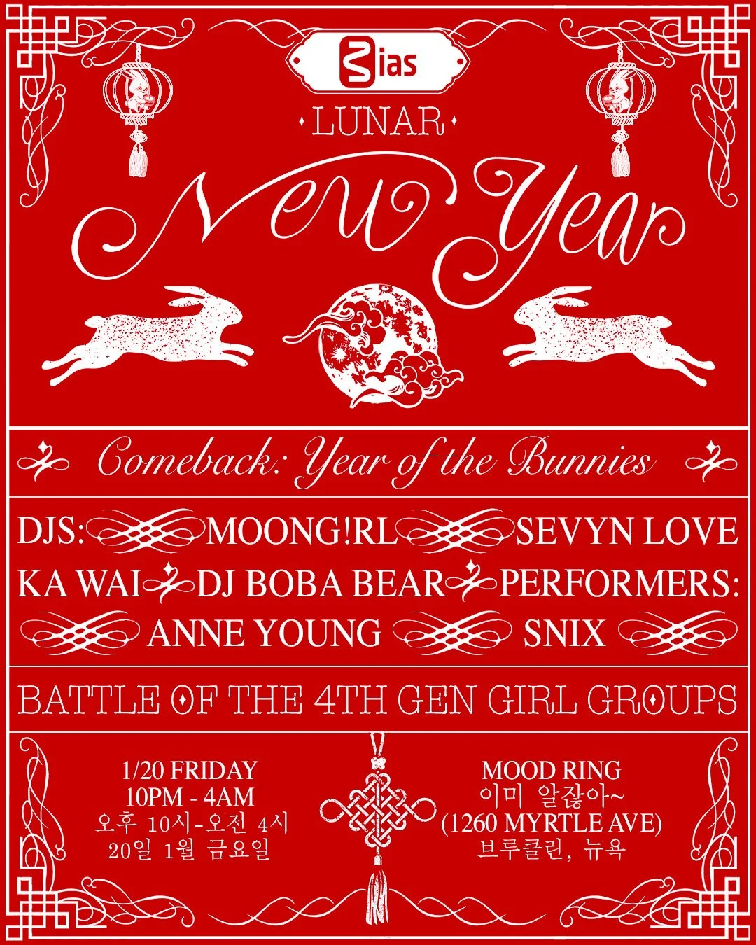 Back to All Events BIAS COMEBACK LUNAR NEW YEAR: YEAR OF THE BUNNIES Friday, January 20, 2023 10:00 PM Saturday, January 21, 2023 4:00 AM Mood Ring 1260 Myrtle Avenue Brooklyn, NY, 11221 United States (map) Google Calendar ICS