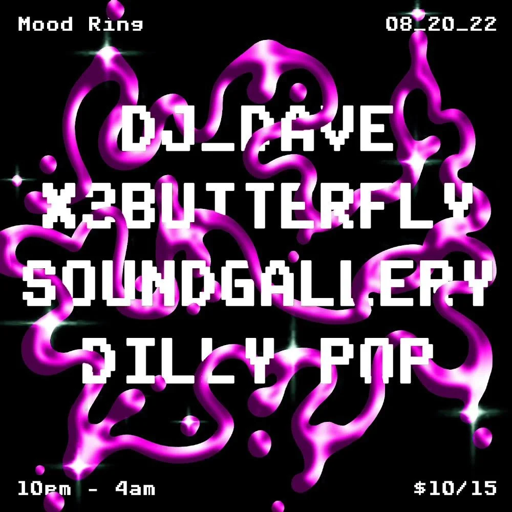 DJ Dave, X3butterfly, Soundgallery, Dilly Pop Saturday, August 20, 2022 10:00 PM Sunday, August 21, 2022 4:00 AM Mood Ring 1260 Myrtle Avenue Brooklyn, NY, 11221 United States (map) Google Calendar ICS