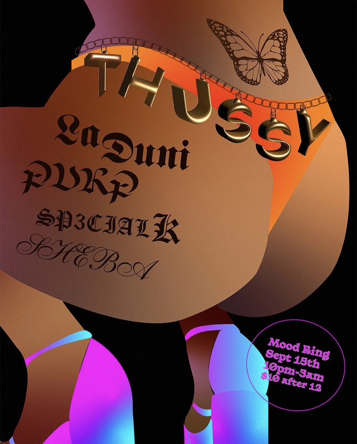 Thussy with La Duni, Special K, Purp, Sheba Thursday, September 15, 2022 10:00 PM Friday, September 16, 2022 3:00 AM Mood Ring 1260 Myrtle Avenue Brooklyn, NY, 11221 United States (map) Google Calendar ICS