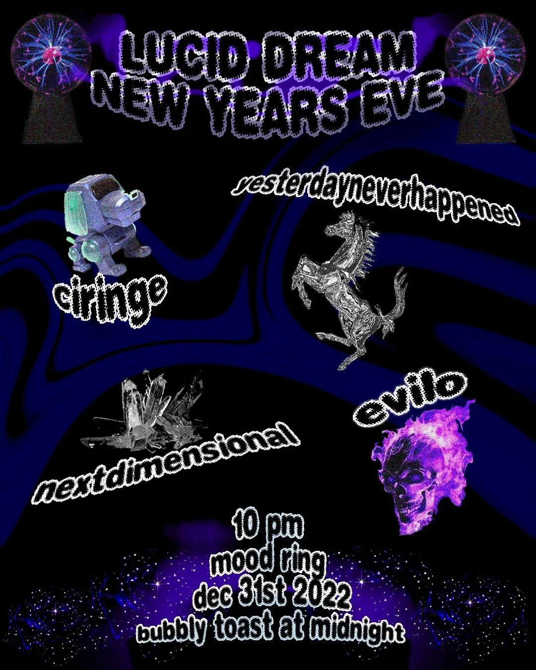 LUCID DREAM ~ NEW YEAR'S EVE PARTY Saturday, December 31, 2022 10:00 PM Sunday, January 1, 2023 4:00 AM Mood Ring 1260 Myrtle Avenue Brooklyn, NY, 11221 United States (map) Google Calendar ICS