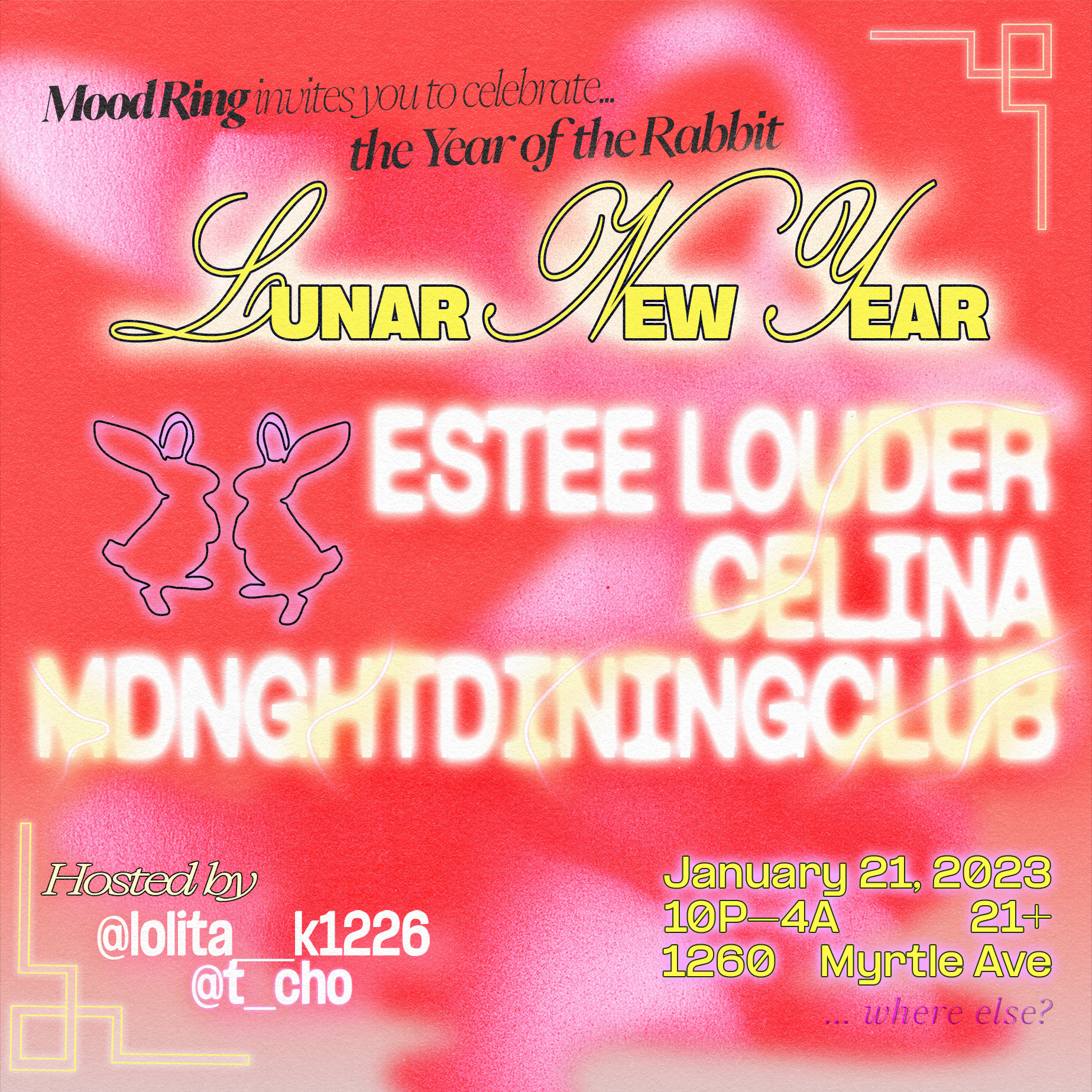 Back to All Events ☆ LUNAR NEW YEAR: YEAR OF THE RABBIT ☆ Saturday, January 21, 2023 10:00 PM Sunday, January 22, 2023 4:00 AM Mood Ring 1260 Myrtle Avenue Brooklyn, NY, 11221 United States (map) Google Calendar ICS