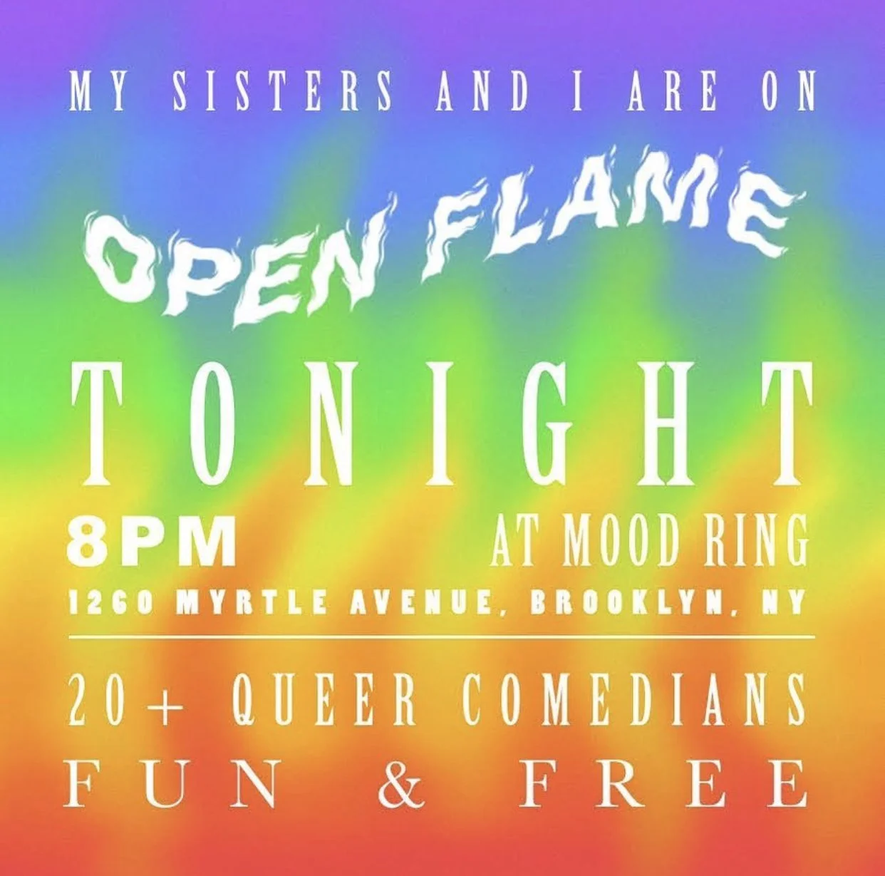 Open Flame LGBTQ Comedy Open Mic Sunday, August 21, 2022 8:00β―PM 10:00β―PM Mood Ring 1260 Myrtle Avenue Brooklyn, NY, 11221 United States (map) Google Calendar ICS