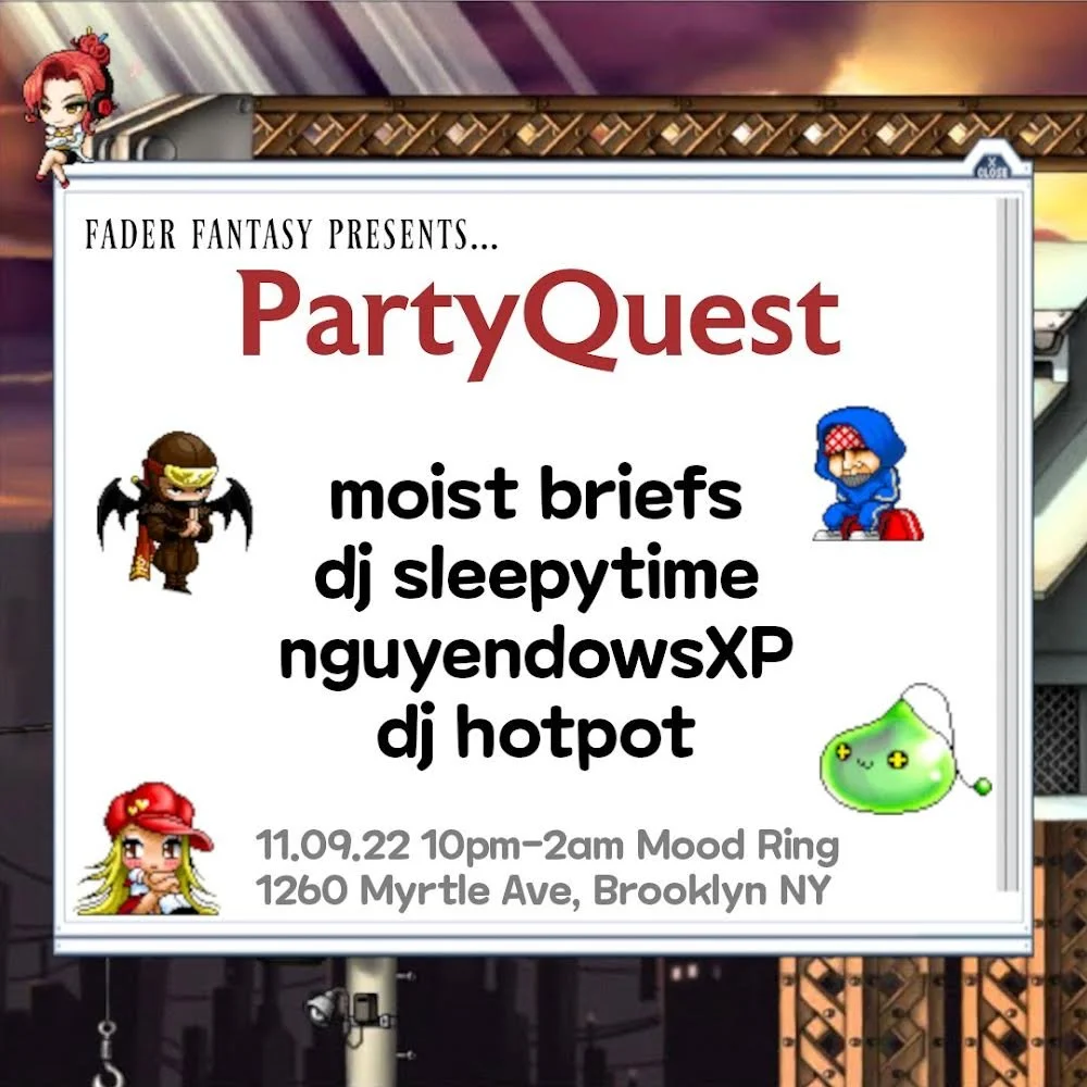 PartyQuest with Moist Briefs, dj sleepytime, nguyendowsXP, djhotpot Wednesday, November 9, 2022 10:00 PM Thursday, November 10, 2022 2:00 AM Mood Ring 1260 Myrtle Avenue Brooklyn, NY, 11221 United States (map) Google Calendar ICS