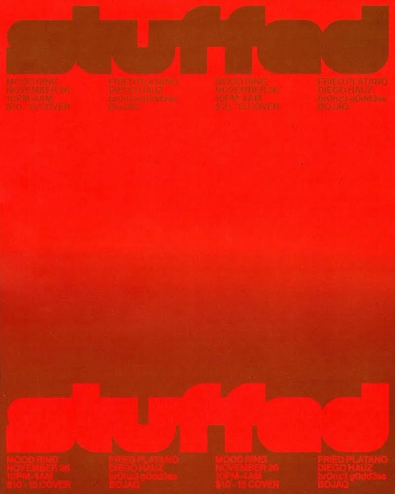 STUFFED with br0nz3_g0dd3ss, Fried Platano, BOJAQ, Diego Hauz Saturday, November 26, 2022 10:00 PM Sunday, November 27, 2022 4:00 AM Mood Ring 1260 Myrtle Avenue Brooklyn, NY, 11221 United States (map) Google Calendar ICS
