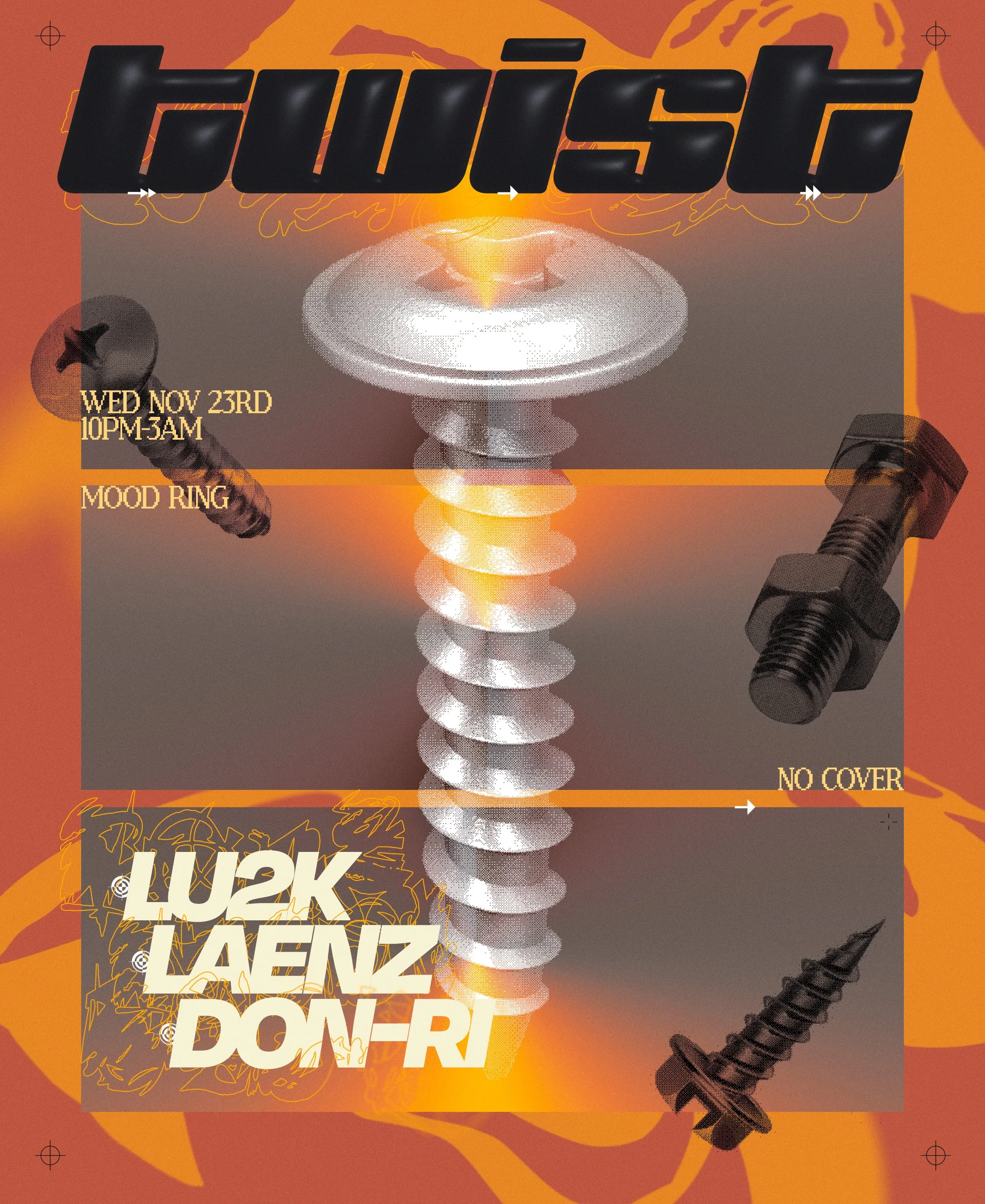 Twist with LU2K, Laenz, Don-Ri Wednesday, November 23, 2022 10:00 PM Thursday, November 24, 2022 3:00 AM Mood Ring 1260 Myrtle Avenue Brooklyn, NY, 11221 United States (map) Google Calendar ICS